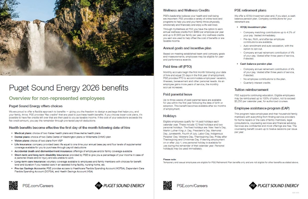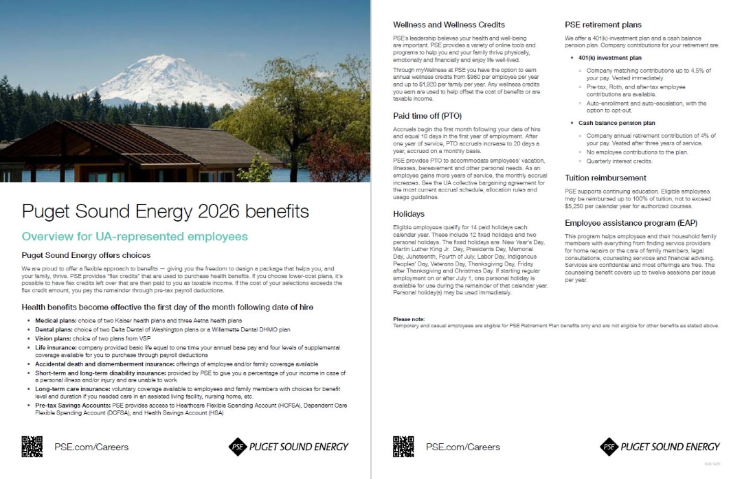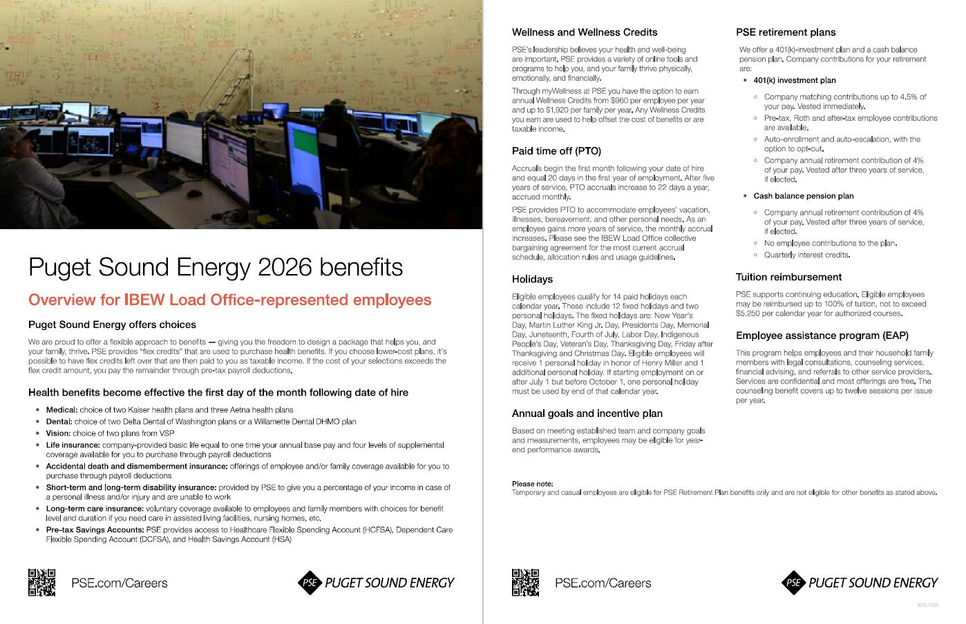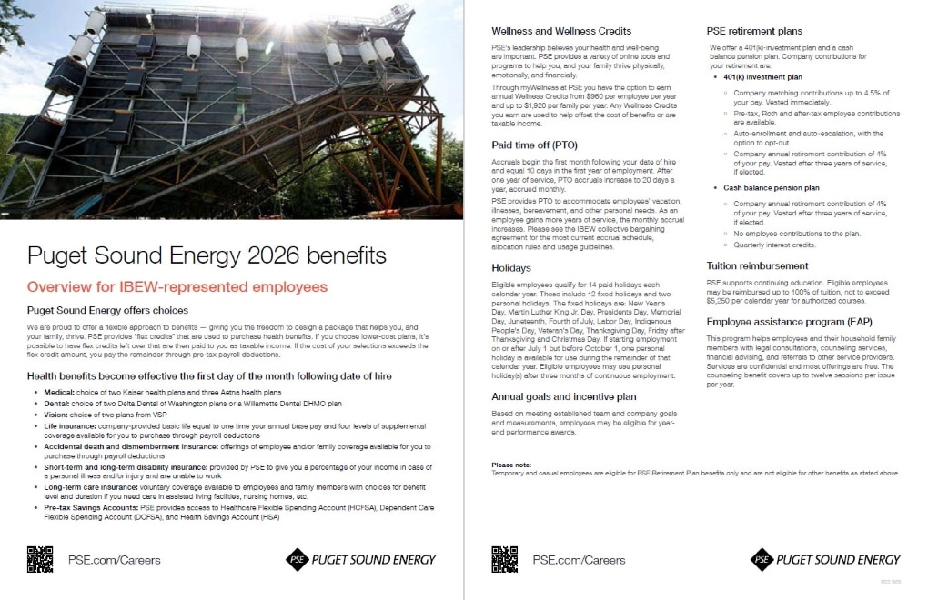 At PSE, you’re part of a company that believes we’re better because you’re here and that you deserve the benefits and perks that are here for you. PSE offers a total compensation package including competitive pay, comprehensive healthcare, incentives, a pension and/or 401k retirement contribution matching, generous and flexible paid time off (PTO), training and professional development opportunities and tuition reimbursement.